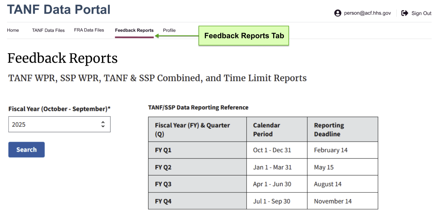 On the Feedback Reports page, complete the search fields for 'Fiscal Year (October – September)' to identify which data you’ll be viewing. The TANF/SSP Data Reporting Reference table is provided to help you map the calendar period content within the file to the reporting fiscal period and its respective reporting deadline.